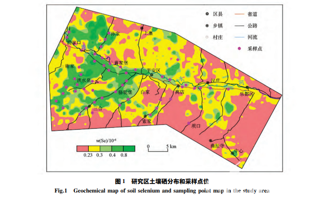 研究區(qū)耕地主要分布在湟水河及各支溝谷地兩 側(cè)。在研究區(qū)耕地中選擇典型富硒( Se≥0.4×10-6 ) 區(qū)和低硒區(qū)布設(shè)表層土壤樣品共 50 件,具體采樣點 位見圖 1。為保證樣品代表性,采取多點組合采樣 的方法,即在設(shè)計樣點位置選擇 1 個主點,并在同一 地塊中以“梅花法”選擇 3 ~ 4 個副點采集表層 0 ~ 20 cm 耕作層土樣,具體方法為用鐵鍬先挖采樣坑,然 后用竹片去除與金屬采樣器接觸的土壤,再采集所 需樣。每件樣品采集后須清除干凈工具上的泥土,將采集的樣品掰碎去除根系、石塊等雜物后將主副 點樣品混合,用四分法留取 1 ~ 1.5 kg 裝入布袋中, 同時記錄采樣點所處的土壤類型、成土母質(zhì)、土地利 用類型等信息。采集的樣品需陰干晾曬,過 20 目尼 龍篩取篩下物 200 g 裝袋封裝送至實驗室分析測 試。樣品測試由安徽省地質(zhì)實驗研究所承擔(dān)完成。 實驗室根據(jù)地質(zhì)礦產(chǎn)行業(yè)標(biāo)準(zhǔn)《多目標(biāo)區(qū)域地球化 學(xué)調(diào)查規(guī)范( 1 ∶ 250 000) DZ /T0258-2014》、中國地 質(zhì)調(diào)查局《生態(tài)地球化學(xué)評價樣品分析技術(shù)要求 ( 試行) 》( DD2005-03) 、《生態(tài)地球化學(xué)評價樣品分 析外部檢查質(zhì)量控制暫行規(guī)定》和《生態(tài)地球化學(xué)評價樣品分析技術(shù)要求補(bǔ)充規(guī)定》等相關(guān)技術(shù)標(biāo) 準(zhǔn),結(jié)合實驗室的實際情況采用國標(biāo)提取方法,選用 實驗室最先進(jìn)的分析儀器測試各項指標(biāo)含量。將樣品放置于小于 60 ℃ 的恒溫干燥箱(上海精宏實驗設(shè)備有限公司)內(nèi)充分 烘干。稱取 10 g 烘干樣品,用 25 mL 趕凈二氧化碳 的水浸泡,用離子選擇性電極法( ISE) 測定 pH。分 取 10 g 干樣經(jīng)瑪瑙球磨機(jī)研磨至 200 目,在 750 ℃ 下艾斯卡半熔,熱水提取后分取提取液,加熱酸化, 硼氫化鉀還原,原子熒光法( AFS) 測定土壤總 Se。 分 取100g干樣經(jīng)瑪瑙球磨機(jī)研磨至1 0 0目,稱取 2.5 g 于 250 mL 聚乙烯燒杯中,加蒸餾水 25 mL,超 聲提取 30 min 離心分離,清液經(jīng) 0.45 μm 濾膜過濾, 原子熒光光譜法( AFS) 測定水溶態(tài) Se,殘渣經(jīng)水洗 后,棄去水相留下殘渣。