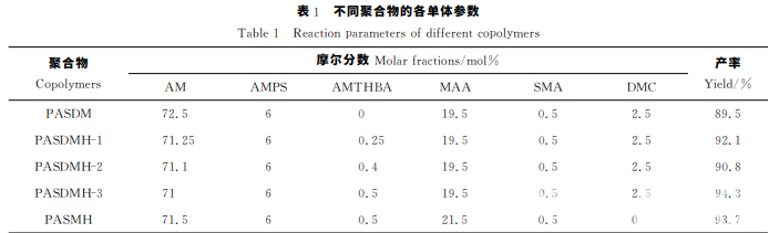 本實驗采 用 自 由 基 膠 束 共 聚 法,將一 定 量 的 AM、AMPS溶解在蒸餾水中,混合加入 MAA,以及提 前溶解在乙 醇 中 的 定 量 AMTHBA、SMA 以及 DMC。 充分攪拌混合溶液,通過滴加1mol/L 的 NaOH 將溶 液pH 調節至7。向溶液中加入SDS,使未溶解的疏水 單體溶解于SDS的增溶膠束中??刂茊误w總固含量為 10 %,混合溶劑乙醇和水的質量比為1∶10。將混 合 溶液加入裝 有 攪 拌 裝 置 的 三 口 瓶 中,恒 溫 反 應。通 過 注射器將偶氮二異丁基脒鹽酸鹽(AINA)注入三口瓶, 70 ℃條件 下 反 應5h后結 束。向產物中加入無水乙 醇,充分攪拌至 析 出 沉 淀,反復浸泡并洗滌沉淀物,烘 干即得到聚 合 物 PASDMH。利 用相同的反應工藝制 備一系列不同辣素含量以及 不 含 DMC 單體 的 疏 水 締 合聚合物,并測試它們的化學性能。疏水締合聚合物的單體組成比例詳見表1。