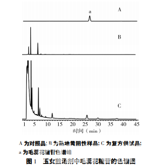 對照品溶液: 精密稱取毛蕊花糖 苷對照品 5.96 mg,用 16%乙腈定容于 5 ml 容量瓶, 即得。 復方供試品溶液: 按經方組成稱取藥材,加入6 倍量水,武火煎煮 5 min 后文火 30 min,取制得的 復方 水 提 液 1 ml,用 甲 醇 定 容 至 2 ml 容 量 瓶, 0.45 μm微孔濾膜過濾,即得。 熟地黃陰性樣品溶液: 按經方組成稱取除熟地 黃以外的藥材,按“復方供試品溶液”項下的方法制 備,即得。