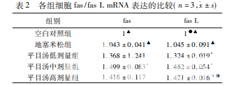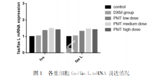 與空白 對照組相比,平目湯各組 fas、fas L 蛋白表達(dá)均上調(diào),差異有 統(tǒng)計學(xué)意義( P < 0. 05) ,地塞米松組無統(tǒng)計學(xué)差異( P > 0. 05) 。在升高 fas 表達(dá)方面,平目湯高劑量組與平目湯中 劑量組、平目湯低劑量組比較,差異有統(tǒng)計學(xué)意義( P < 0. 05) 。平目湯中劑量組與平目湯低劑量組比較,無統(tǒng)計學(xué) 差異( P > 0. 05) 。