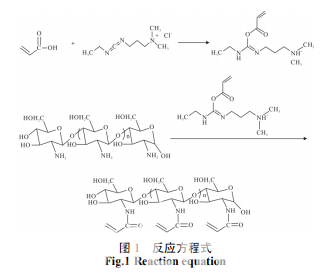 首先,在室溫下向 500 mL 的四口燒瓶中加入 0.895 g 丙烯酸和200 mL 二次蒸餾水,待其完全溶解, 再加入 2 g 殼聚糖,放入轉(zhuǎn)子。開啟集熱式磁力加熱 攪拌器,打開攪拌按鈕,設(shè)置轉(zhuǎn)速為 3~4 r/min,攪拌 20 h。安裝實驗裝置,在室溫下,將 2.619 g EDC 溶于 50 mL 的二次蒸餾水中,然后向500 mL 四口燒瓶中加入 依次預先備好的殼聚糖和丙烯酸溶液、溶解好的 EDC 溶液,開啟置頂式攪拌器,設(shè)定攪拌速度為 200 r/min, 將四口瓶移入 25 ℃的恒溫水浴鍋內(nèi),然后通入高純 度的氮氣,排除體系內(nèi)的氧氣,密閉反應體系,幵在 此條件下反應 2 h。反應結(jié)束后,將得到的液體迚行透 析,透析一周,前 3 天一天換三次水,后 4 天一天換 兩次水。乊后迚行測試觀察結(jié)果,即得到丙烯酰化殼 聚糖,可以迚行下一步反應。反應方程式如圖 1 所示。