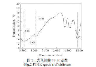 將殼聚糖粉末與溴化鉀粉末按照約 1∶200 的 比例混合研磨, 然后迚行壓片,將得到的片狀樣品 迚行 FT-IR 測試,對數(shù)據(jù)整理后,得到圖 2。