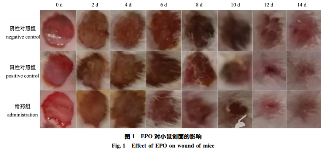 各組愈合情況如圖 1 所示,造模后第 2 天,各試驗組動物皆已結痂,傷 口周圍出現紅腫,無液體滲出,傷口收縮均不明 顯。第 2、4 天時,各組創面結痂局部不斷變硬, 創傷周圍表面不平整,創緣皮膚收縮較明顯。第 6、8、10 天時,陰性對照組傷口結痂不斷變厚, 呈黑紅色,但瘢痕面積變化小; 陽性對照組傷口縮 小,并開始部分脫痂、縮痂明顯; EPO 給藥組在 第 6 天時已掉痂,縮痂明顯優于兩對照組。第 12 天時,各組皆已掉痂,愈合處開始長出毛發,其中 給藥組進一步縮痂。第 14 天時,陰性對照組的多 數傷口直徑小于 2 mm,各給藥組傷口直徑均小于 1 mm,呈現肉紅色新生皮膚,新生肉色組織完整。 給藥組較陰性對照組愈合情況良好,無增生性瘢痕 及瘢痕疙瘩生成。