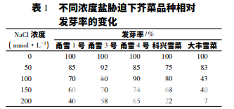 鹽害會(huì)對(duì)植物的生長(zhǎng)發(fā)育造成不利影響,而植物的耐鹽程度也因不同發(fā)育階段而存在差異。在植 物生長(zhǎng)發(fā)育過(guò)程中,最脆弱的時(shí)期是萌發(fā)期和幼苗 期。植物在鹽脅迫環(huán)境下能否順利萌發(fā),以及幼苗 期能 否 順 利 生 長(zhǎng),在一定程度上反應(yīng)出其耐鹽 性。目前,關(guān)于葉用芥菜種質(zhì)資源耐鹽性評(píng)價(jià) 方面的研究較少。崔世友等通過(guò)實(shí)地測(cè)定灘涂 上生長(zhǎng)的葉用芥菜的根際土壤電導(dǎo)率,鑒定出了強(qiáng) 耐鹽的葉用芥菜材料,其耐鹽性強(qiáng)于大麥等耐鹽性 較強(qiáng)的作物,可在 EC 1 ∶ 5 值達(dá) 2. 366 mS·cm-1 的 濱海鹽土上生長(zhǎng)。