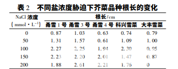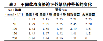 從表 3 可看出,當(dāng)鹽濃度為 50 mmol·L-1 時(shí), 除甬雪 1 號(hào)和科興雪菜外,其余幾個(gè)品種的莖長(zhǎng)相 比對(duì)照沒(méi)有明顯變化; 當(dāng)鹽濃度≥100 mmol·L-1 時(shí),5 個(gè)品種的莖長(zhǎng)相比對(duì)照基本呈現(xiàn)下降趨勢(shì), 且隨著鹽濃度的不斷升高,除甬雪 1 號(hào)和甬雪 4 號(hào) 外,其余處理根長(zhǎng)呈降低趨勢(shì)。當(dāng)鹽濃度升高至 200 mmol·L-1 時(shí),大豐雪菜的莖長(zhǎng)為 0,表明生長(zhǎng) 受到嚴(yán)重抑制。