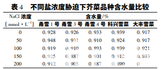 從表 4 可以看出,當(dāng)鹽濃度為 50 mmol·L-1 時(shí),5 個(gè)品種的含水量都在 90%以上; 當(dāng)鹽濃度為100 mmol·L-1 時(shí),除甬雪 4 號(hào)以外,其余 4 個(gè)品種 的含水量都在 90%以上; 當(dāng)鹽濃度為 150 mmol·L-1 時(shí),甬雪 3 號(hào)和大豐雪菜的含水量降至 90%以下, 其余 3 個(gè)品種仍在 90%以上; 當(dāng)鹽濃度升高至 200 mmol·L-1 時(shí),甬雪 4 號(hào)和科興雪菜的含水量降至 90%以下,而甬雪 1 號(hào)和甬雪 3 號(hào)的含水量仍在 90%以上。