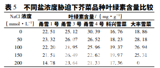 從表 5 可看出,當(dāng)鹽濃度≤150 mmol·L-1 時(shí), 鹽脅迫對(duì)甬雪 1 號(hào)葉綠素含量的影響不是很大; 當(dāng) 鹽濃度升至 200 mmol·L-1 時(shí),甬雪 1 號(hào)的葉綠素 含量明顯降低。隨著鹽濃度的升高,甬雪 3 號(hào)的葉 綠素含量呈現(xiàn)微小的 2 次先升高再降低的趨勢(shì); 鹽 濃度對(duì)甬雪 4 號(hào)葉綠素含量的影響表現(xiàn)為負(fù)相關(guān); 而科興雪菜與大豐雪菜在不同鹽濃度的脅迫下其葉 綠素含量呈先上升后下降的趨勢(shì),峰值分別出現(xiàn)在 150 和 50 mmol·L-1 鹽脅迫時(shí)。