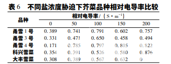 從表 6 可知,5 個(gè)品種中,甬雪 4 號(hào)、科興雪 菜和大豐雪菜的相對(duì)電導(dǎo)率基本隨著鹽濃度的上升 呈上升趨勢(shì); 甬雪 1 號(hào)和甬雪 3 號(hào)相對(duì)電導(dǎo)率的峰 值均出現(xiàn)在 100 mmol·L-1 鹽脅迫。