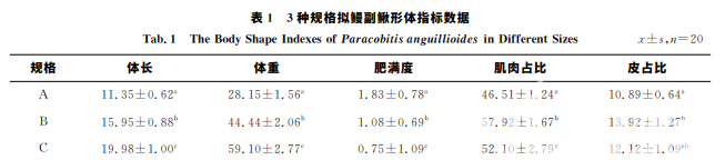1)不同規(guī)格的擬鰻副鰍,其形體指標隨規(guī)格的增大,均呈現(xiàn)先增大后下降趨勢,中等規(guī)格的鰻鰍肌肉占 體質(zhì)量比例最高.